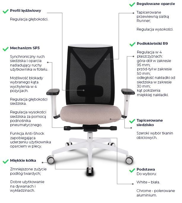 Mechanim SP3 umożliwia także regulację głębokości siedziska w zakresie 58 mm i wysokości siedziska za pomocą podnośnika pneumatycznego.