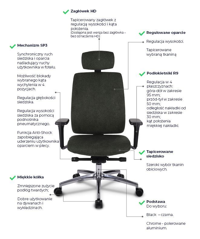 Fotel został wykonany z najwyższej jakości materiałów. Szeroki wachlarz kolorystyczny jak i zarówno rodzaj tapicerek daje możliwość dużego wyboru skonfigurowania fotela według własnych preferencji. Informacje podane są w KONFIGURATORZE produktu, podczas wybierania tapicerki. Ponadto model tez został wyposażony w dużą ilość ergonomicznych funkcji, które gwarantują komfortowe i wygodne użytkowanie.