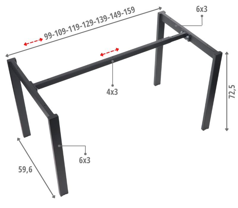 Solidne profile: Nogi o przekroju 60x30 mm (grubość ścianki 1,35 mm) oraz belki 40x30 mm (ścianka 1,2 mm) gwarantują sztywność biurka nawet przy dużym obciążeniu. -