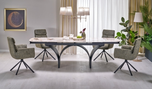 wymiary: 180-260/90/74 cm, stół rozkładany, materiał: ceramika / szkło / stal malowana proszkowo, kolor: blat - beżowy marmur, noga - czarny