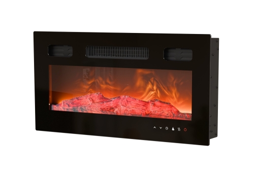 wymiary: 60/31/12 cm, materiał: szkło / metal, kolor: czarny, napięcie - 230V AC / moc - maks. 1500W / sterowanie pilotem / timer - 10 ustawień / zakres temp: 18-35 stopni C / 3 prędkości płomienia / 5 kolorów płomienia / 5 różnych jasności drewna
