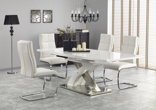 Stół wykonany jest z wysokiej jakości materiałów, w tym eleganckiego szkła o ekstra białym odcieniu oraz lakierowanego MDF w tym samym kolorze, co nadaje mu nowoczesny i stylowy wygląd. Stabilna konstrukcja ze stali nierdzewnej zapewnia nie tylko trwałość, ale także elegancki akcent, który podkreśla całą kompozycję. Całość jest łatwa do utrzymania w czystości, co czyni go idealnym wyborem do każdego domu.
