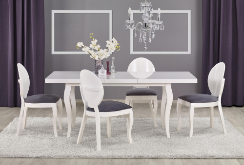 stół rozkładany, wymiary: 140-180/80/75 cm, materiał: blat - płyta MDF laminowana + obrzeża ABS, nogi - drewno lite (bukowe), kolor: biały