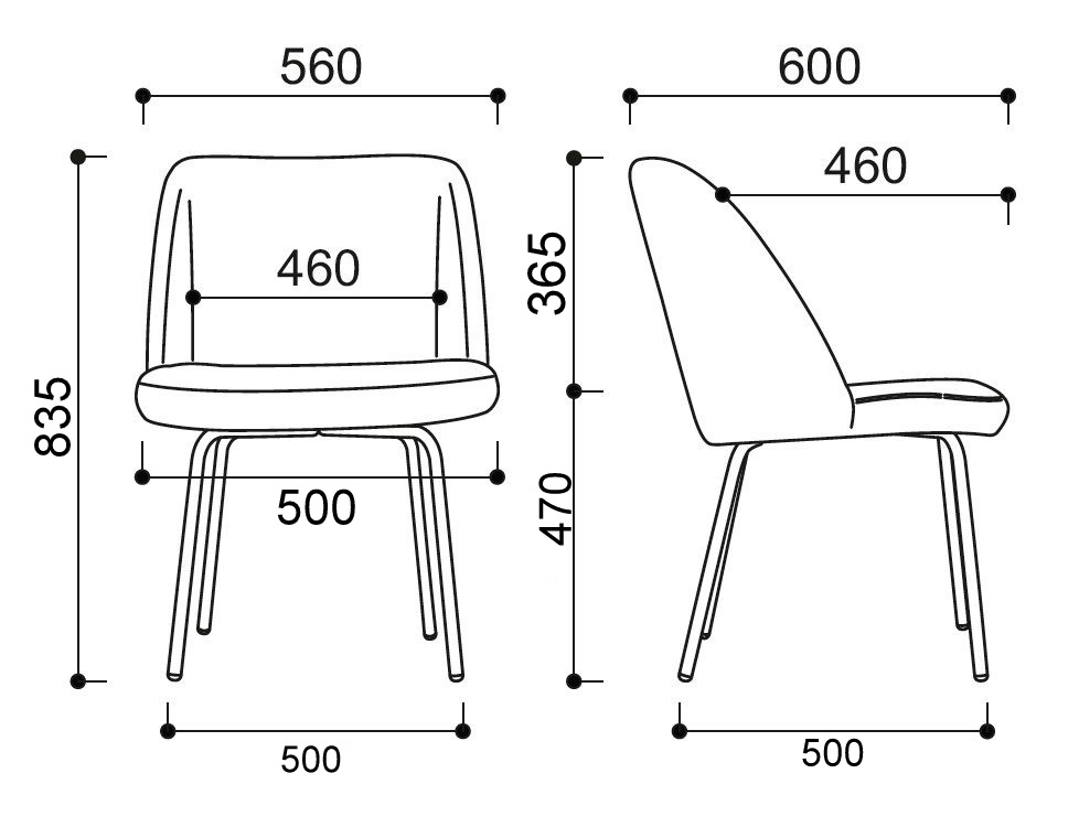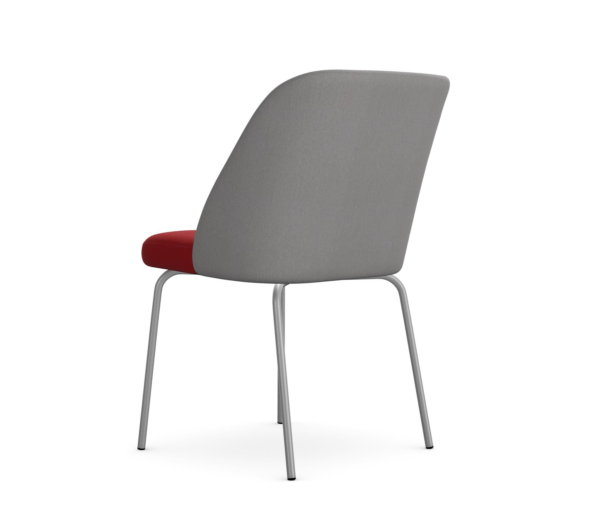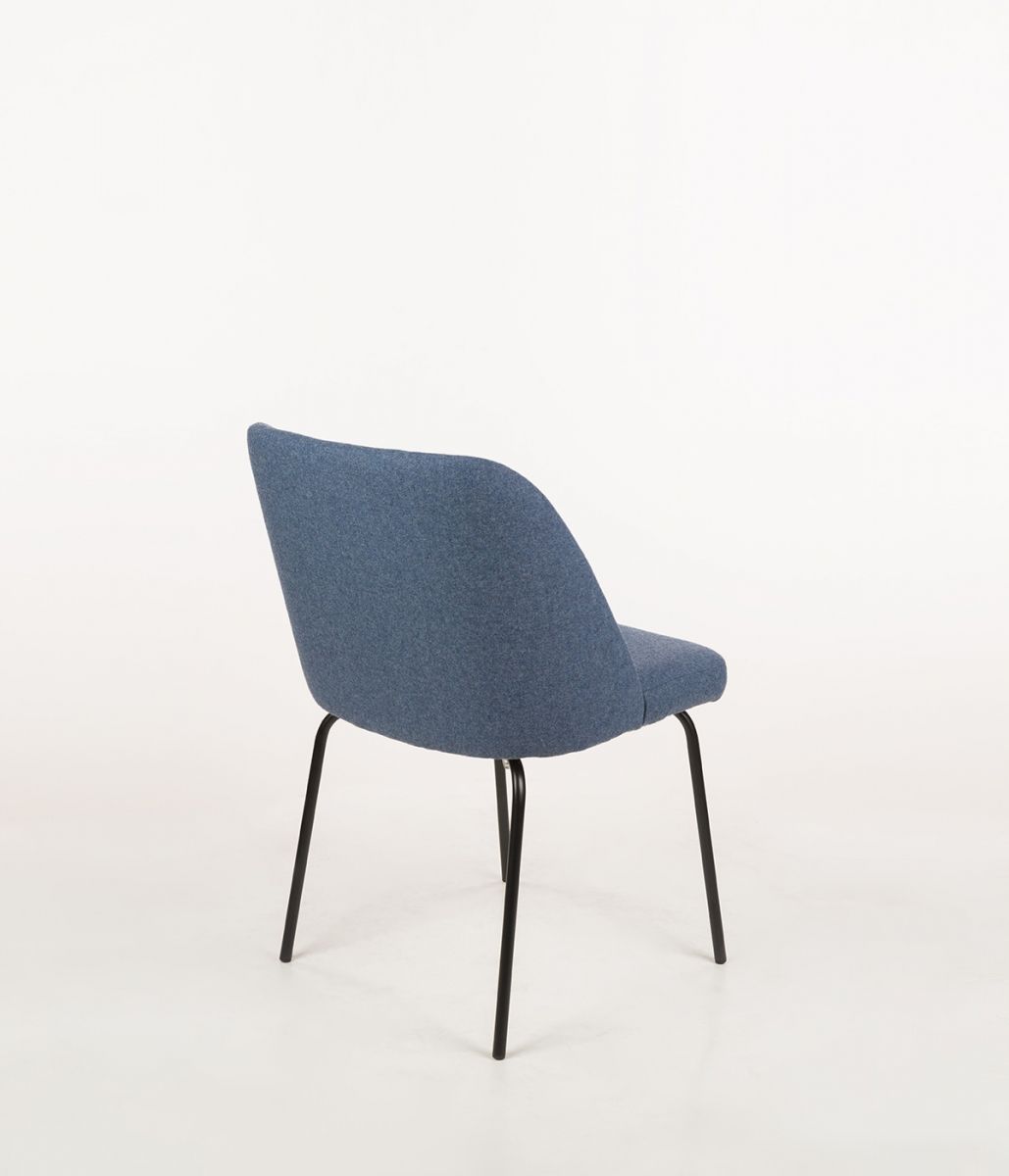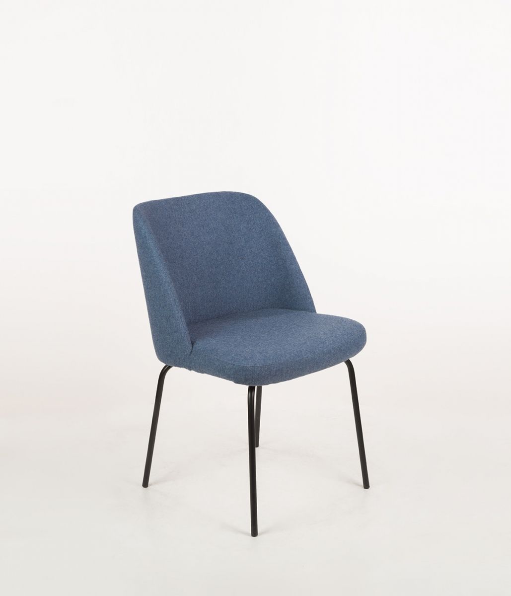 Charakteryzuje się dynamiczną, kubełkową formą oparcia, która łagodnie przechodzi w siedzisko. Prezentowana wersja jest pozbawiona podłokietników, co podkreśla jego lekkość i ułatwia wsunięcie pod stół, możliwość dwukolorowego tapicerowania oparcia i kontrastującego siedziska, co stanowi wyrazisty akcent wizualny.