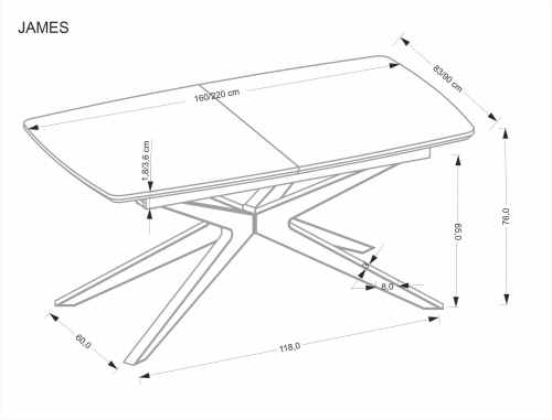 | Stół rozkładany JAMES to idealny wybór dla osób poszukujących funkcjonalnego i stylowego mebla, który dopasuje się do każdego wnętrza. Dzięki możliwości rozłożenia o dodatkowe 60 cm, dostosujesz jego rozmiar do potrzeb Twojej rodziny oraz przyjaciół, co czyni go doskonałym rozwiązaniem zarówno na codzienne posiłki, jak i na większe spotkania. Oto najważniejsze cechy tego wyjątkowego stołu: - Wymiary: W momencie złożenia 160 cm, a po rozłożeniu 220 cm długości; 90 cm szerokości oraz 76 cm wysokości, co pozwala na komfortowe użytkowanie.