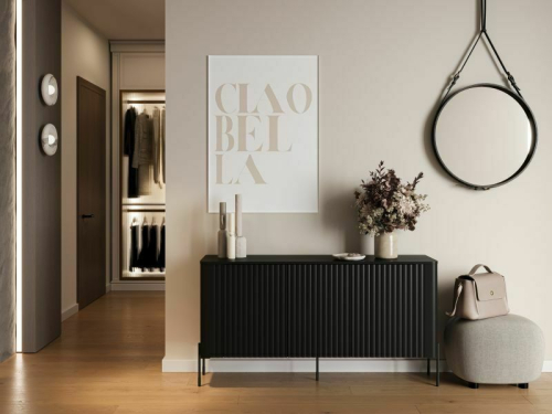 VERA komoda 150 wymiary: W/S/G - 80cm/150cm/39,60cm materiał: korpus: płyta wiórowa 16mm fronty: płyta MDF laminowana 18mm Nózki: metalowe (czarny), wysokość 20 cm Uchwyt: system PUSH TO OPEN