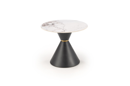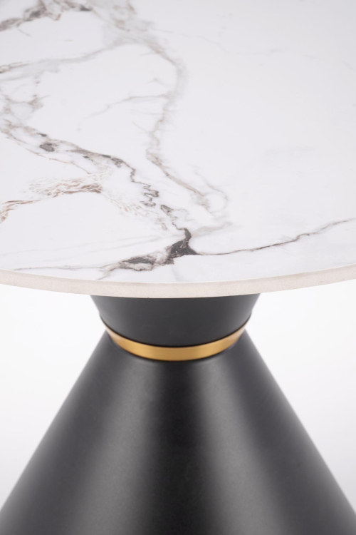 Ława GORETTI_S to wyjątkowy element, który łączy w sobie elegancję i nowoczesność. Jej okrągły blat o średnicy 60 cm wykonany jest z trwałego spieku stylizowanego na biały marmur, co nadaje jej luksusowego charakteru. Kontrastująca podstawa w kolorze czarnym, wykonana ze stali malowanej proszkowo, wyróżnia się nowoczesnym kształtem stożka. Delikatny akcent w postaci złotego pierścienia dodaje całości szyku i wyrafinowania.