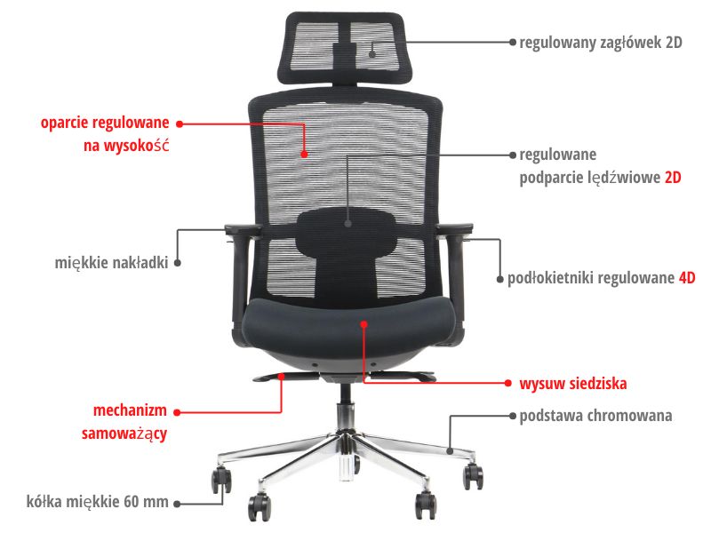 Regulowane Podparcie Lędźwiowe 2D: Możliwość regulacji góra-dół oraz przód-tył, aby idealnie podeprzeć naturalną krzywiznę kręgosłupa.  |